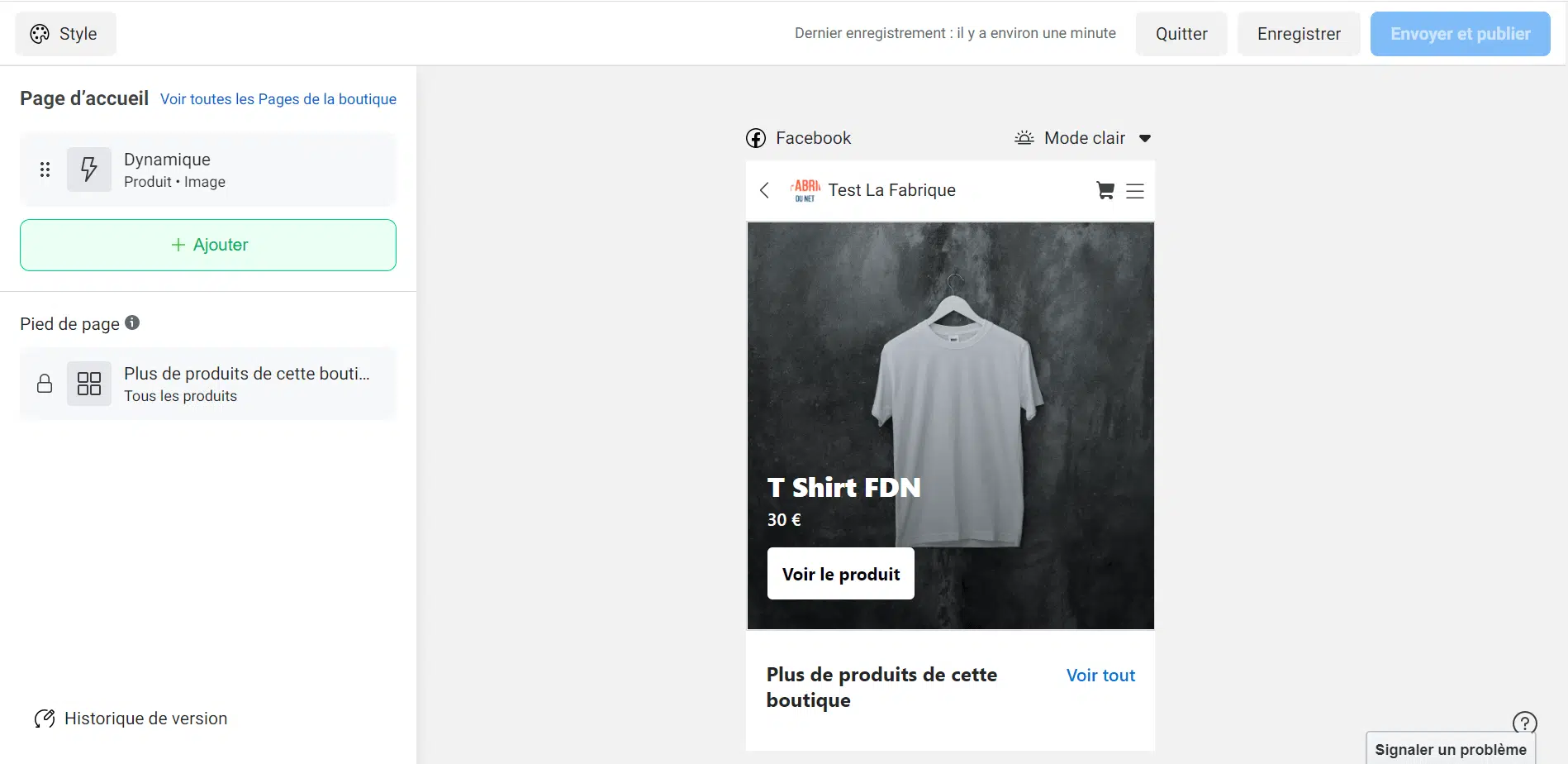 Une fois que vous êtes satisfait du rendu de votre page, cliquez en haut à droite pour publier votre boutique sur votre page Facebook Entreprise.