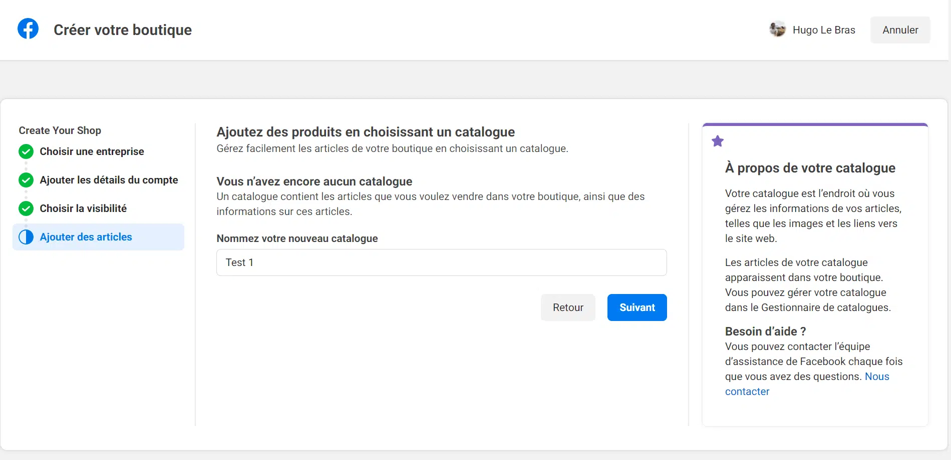 Sélectionnez l’entreprise où vous souhaitez mettre en place la boutique, puis renseignez les détails du compte et passez à la partie catalogue.