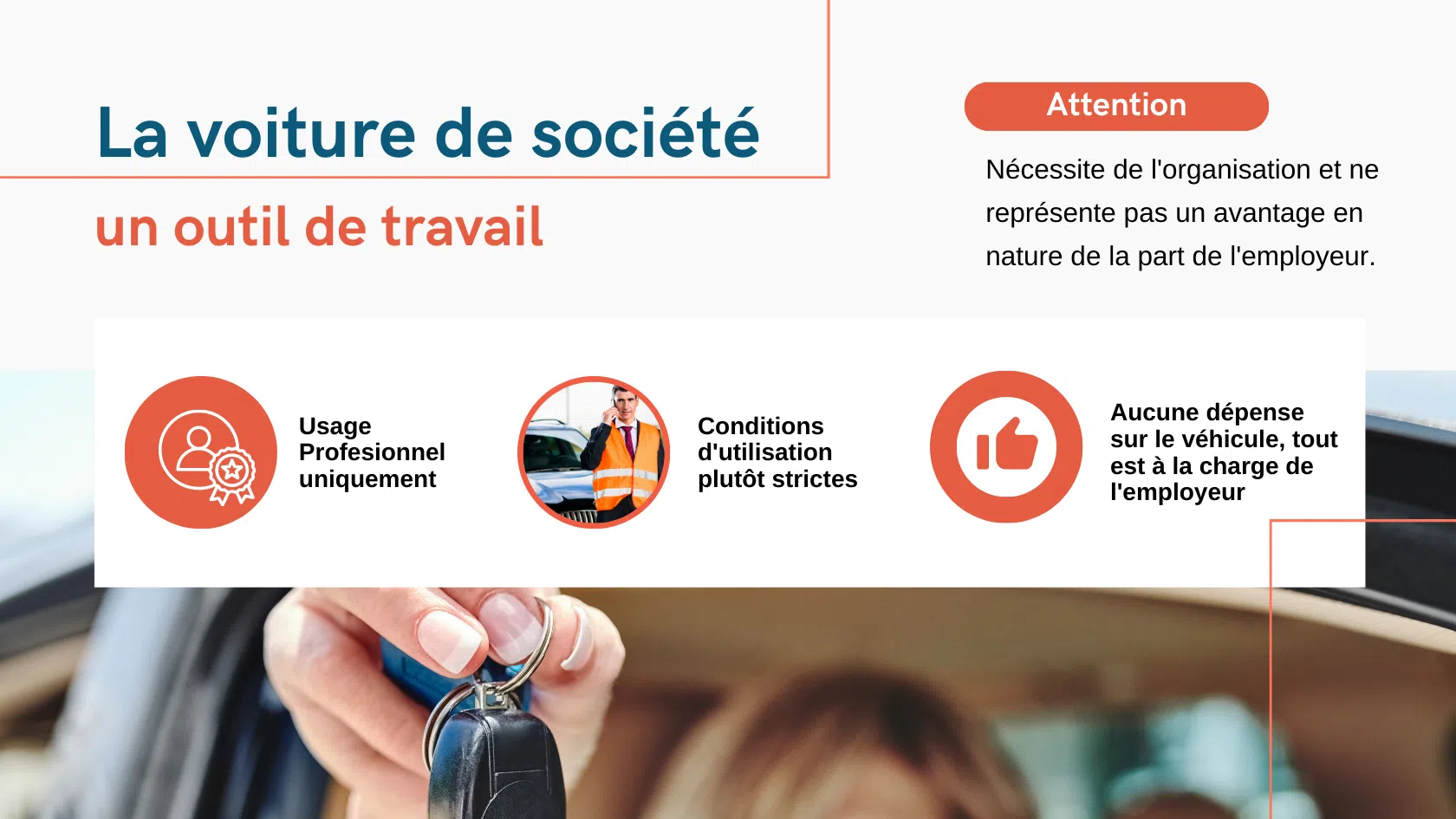 - Un gain financier : le coût d’utilisation du véhicule est pris en charge par l’employeur (achat ou location, entretien, assurance, etc.). Le salarié n’a donc pas à supporter ces frais, ce qui peut représenter une économie significative pour lui.