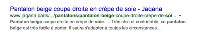- Dans le screenshot ci-dessus, vous observez : le Title en bleu, l’URL en vert et un texte en noir. Les termes en gras renvoient à la requête de l’internaute. Ce texte en noir, c’est la meta description. Cette balise meta description doit être bien optimisée pour répondre à deux objectifs : 1/ donner à l’internaute des informations pertinentes sur le produit en quelques mots depuis le SERP. 2/ Du point de vue SEO, les mots-clés placés dans la meta ont un impact très important. Dans l’exemple ci-dessus, le terme « Pantalon beige » apparaît tout au début de la meta description. Ce n’est pas un hasard. La meta description doit idéalement rester sous 155-160 caractères (espaces compris) pour s’afficher correctement dans les résultats de recherche Google. Comme le Title, chaque fiche-produit doit avoir une meta description unique et engageante.