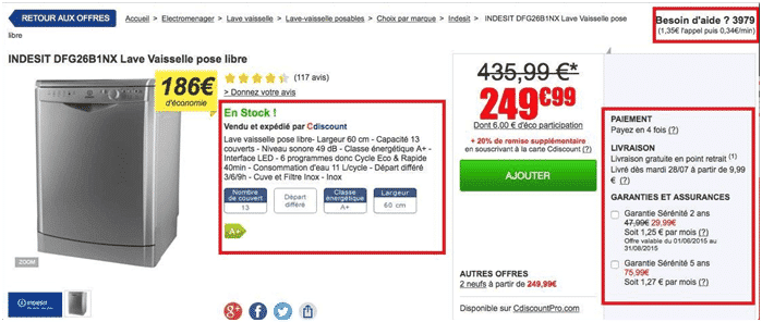 Les éléments de réassurance des fiches-produits doivent répondre aux questions que se posent les visiteurs : les délais de livraison sont-ils rapides ? Existe-t-il différents modes de livraison ? Le paiement est-il sécurisé ? Y-a-t-il des frais de port ? Puis-je suivre ma commande ? D’où proviennent les produits vendus par ce site ? Existe-t-il des programmes de fidélité ? C’est en fonction de toutes ces interrogations légitimes exprimées par vos visiteurs et de leur degré d’importance que vous devez organiser votre stratégie de réassurance. Evidemment, si vous pouvez faire apparaître des labels de certification, mettez-les en évidence. Dans l’absolu, la réassurance doit être partout présente sur votre fiche-produit. La description par exemple doit être conçue dans une optique d’information, mais aussi dans une optique de réassurance.