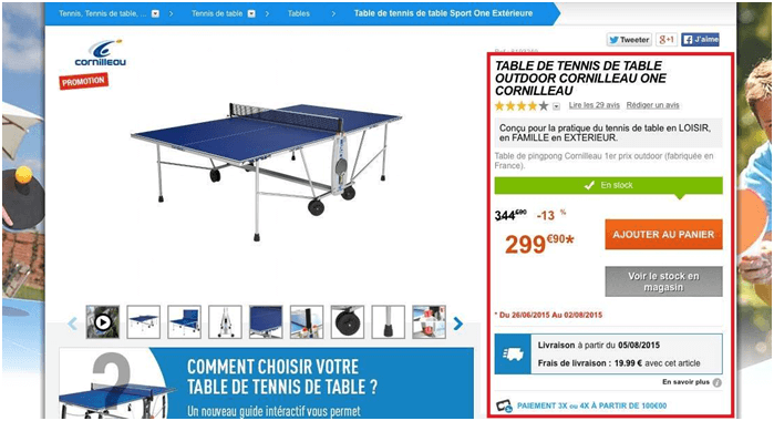 Comment faire en sorte que ces informations importantes soient toujours présentes sur la page ? Tout d’abord, ces éléments doivent être impérativement placés dans un bloc en haut de la fiche, de manière à ce qu’ils soient visibles dès l’ouverture de la page, sans aucune action de l’internaute. Pour qu’ils restent visibles lorsque le visiteur scrolle, il existe une astuce qui consiste à utiliser un bloc flottant, un bloc qui flottera à mesure que le visiteur descendra dans la page. Par ce procédé, le prospect aura toujours les informations utiles, dont le bouton d’ajout panier, sous les yeux. Les blocs flottants sont de plus en plus utilisés par les sites de ecommerce. On les retrouve sur les sites de Darty ou de Decathlon notamment.