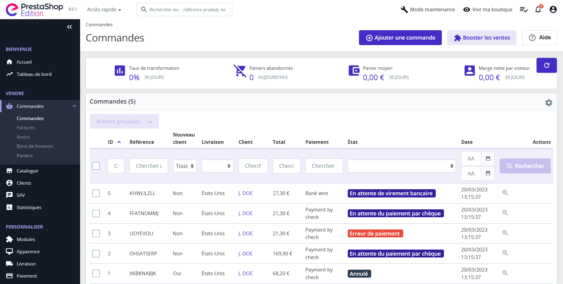 La plateforme de gestion des commandes de PrestaShop Edition vous offre un accès complet à toutes les informations relatives aux transactions effectuées sur votre boutique en ligne. Cette interface vous permet de visualiser toutes les commandes enregistrées, de la plus récente au plus ancienne. Vous avez la possibilité d’ajouter vous-même une commande, si l’un de vos clients rencontre une difficulté pour valider sa commande en ligne par exemple.