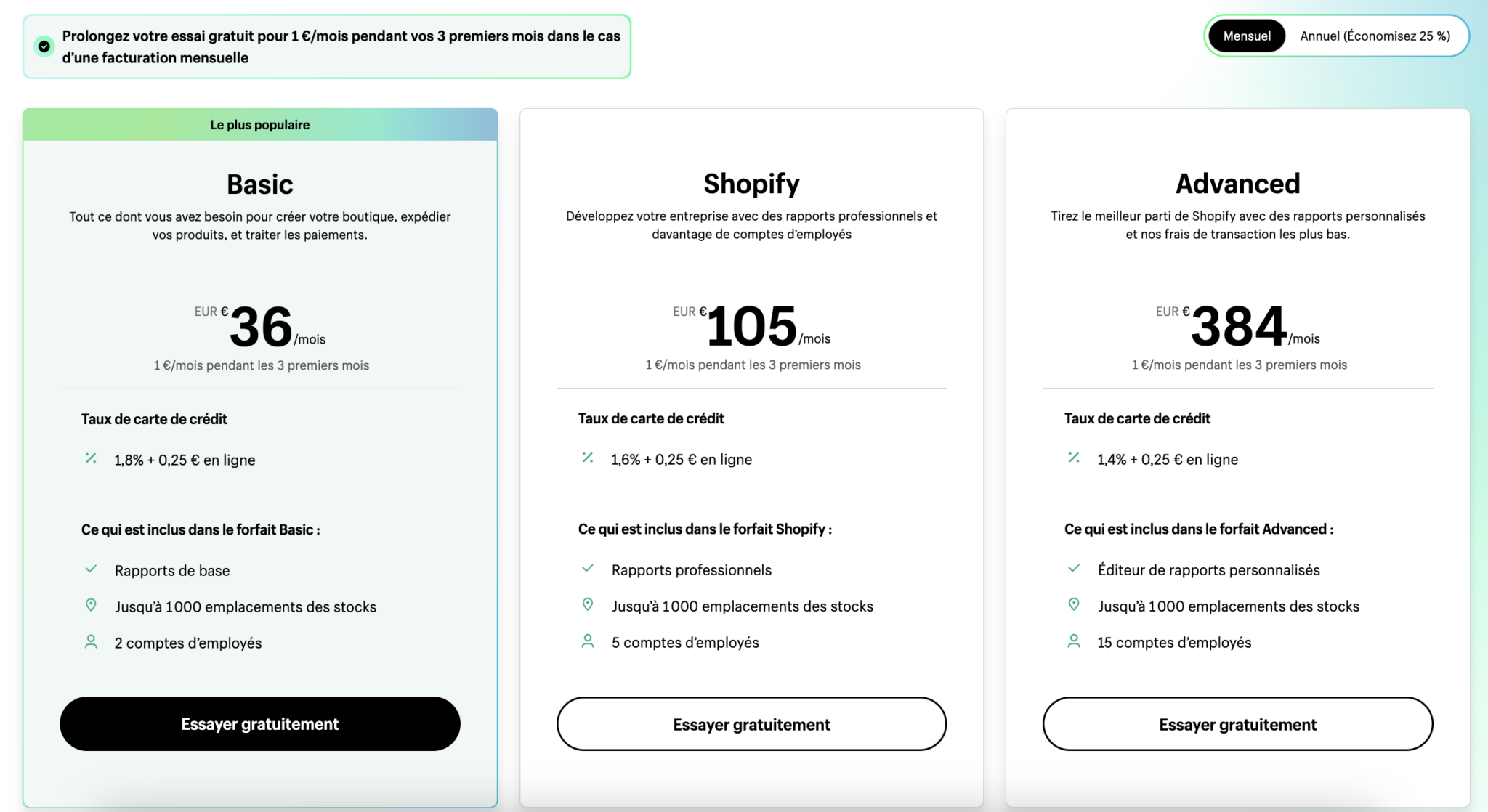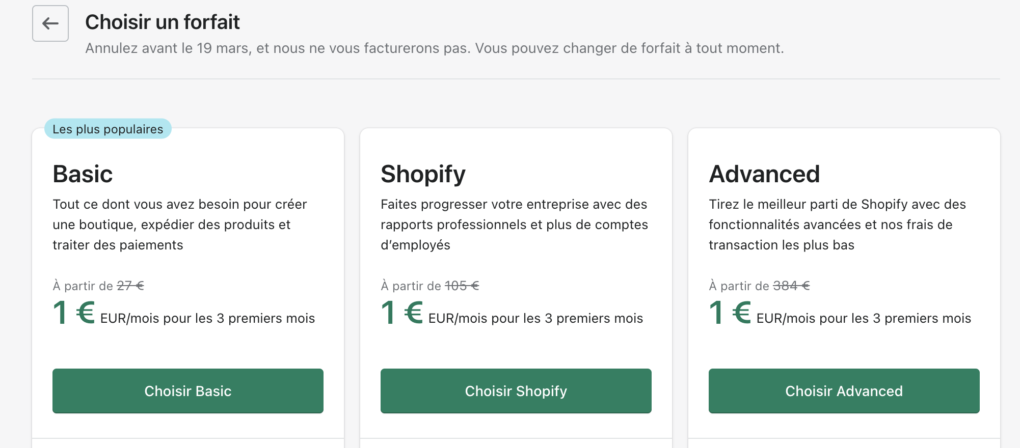 Le délai de 3 jours passé, vous choisissez le tarif qui convient le mieux à votre e-commerce : Basic, Shopify ou Advanced, pour commencer à vendre vos produits.