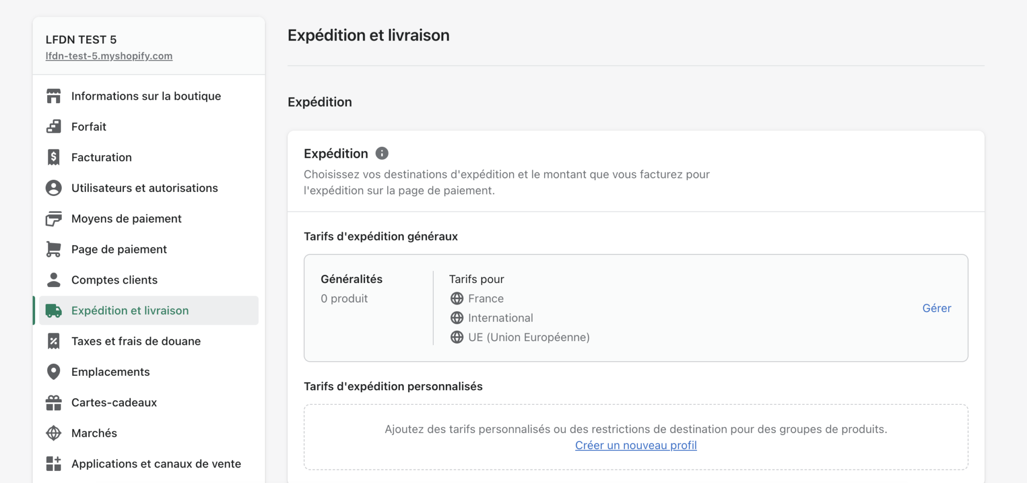 Vous pouvez également profiter de Shopify gratuit pour configurer les modes de livraison, les moyens de paiement acceptés, les taxes et frais de douane si vous vendez ou importez de l’international. Intégrer à votre boutique toute la partie « légale » et réglementaire, ça n’est pas le plus amusant, mais c’est obligatoire afin d’avoir une boutique bien en règle.