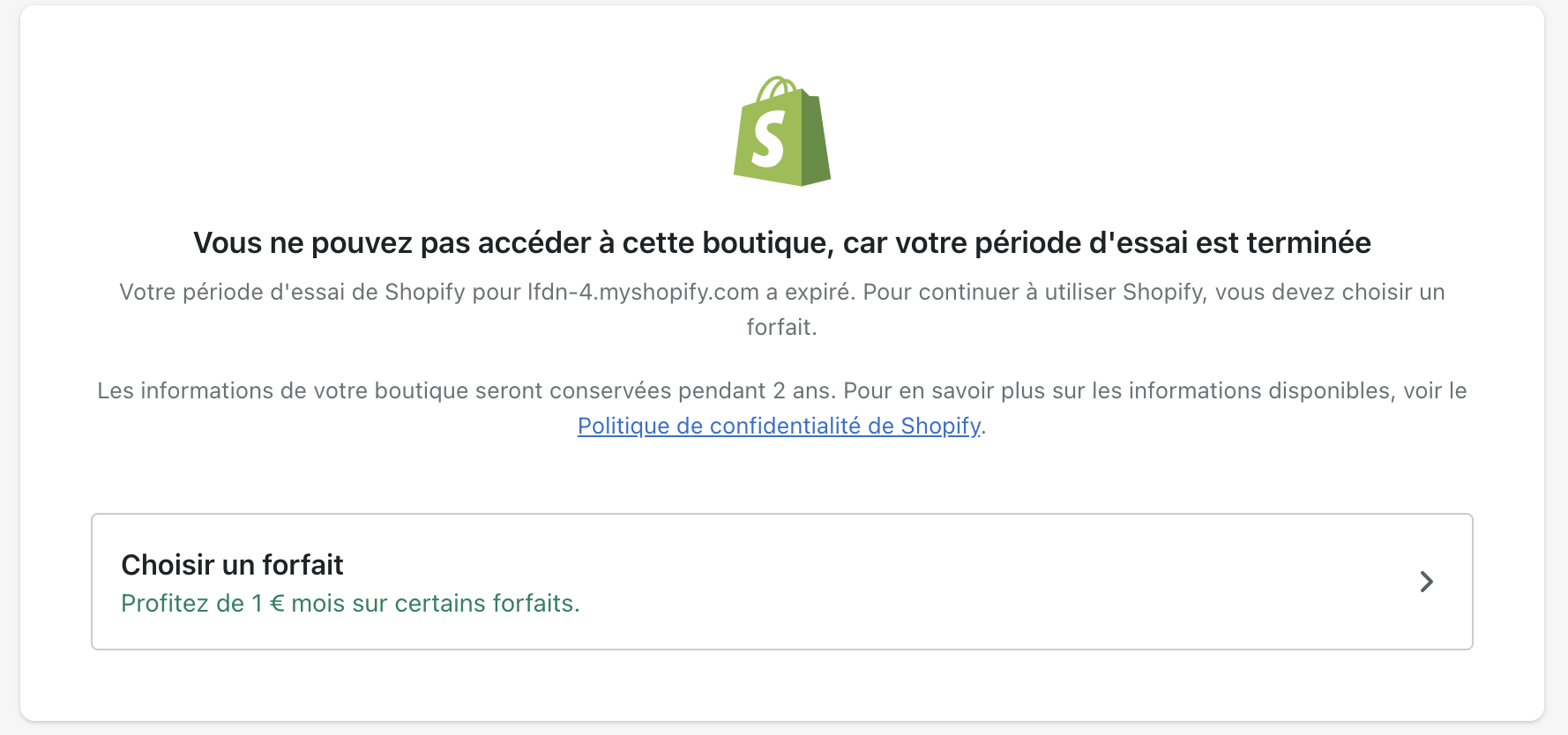 Bien sûr, votre boutique Shopify ne disparaît pas à la fin de l’essai gratuit. Elle est simplement suspendue et n’apparaît plus dans les moteurs de recherche, pour la réactiver, vous choisissez un forfait. Si vous souhaitez vous désabonner de Shopify, vous pouvez laisser votre boutique inactive sans choisir de forfait, vous ne serez pas débité. Et au pire, vous pouvez mettre votre abonnement sur pause quand vous le souhaitez.