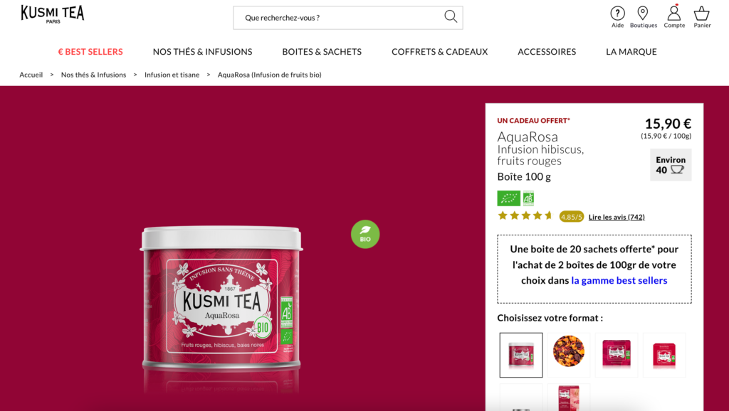 La marque de thés est connue pour ses packagings, ses publicités audacieuses et son univers coloré. Et en y regardant de plus près, le site e-commerce de la marque est tout aussi bien pensé. Penchons-nous sur la page dédiée à une de leur infusion signature, l’infusion AquaRosa, on retrouve en haut de page l’ensemble des informations essentielles avec la photographie du packaging, sur un fond rappelant la couleur du packaging produit, la note des consommateurs, le prix ainsi qu’une offre commerciale alléchante.