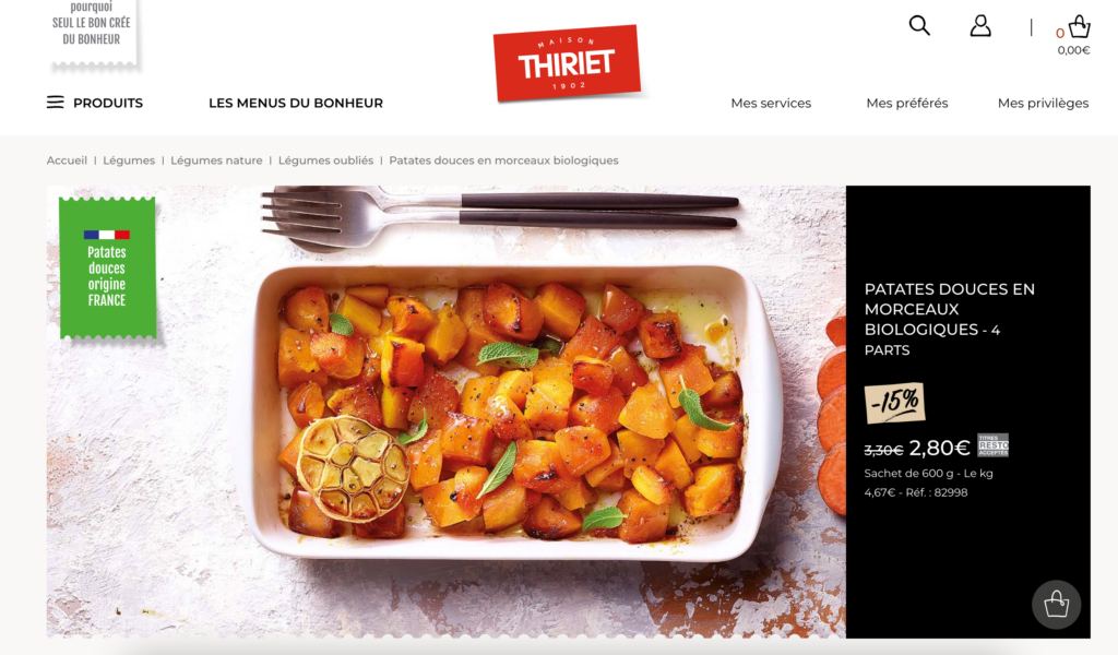 La marque de produits et de plats surgelés propose de la vente par correspondance depuis des années mais à su modernisé sa communication et ses canaux de vente en créant un site e-commerce moderne et très complet. Sur la page produit sélectionnée, nous aimons particulièrement la qualité du design et l’image du plat qui met l’eau à la bouche. On apprécie tout particulièrement les conseils donnés par la marque pour apprendre comment cuisiner l’aliment brut.