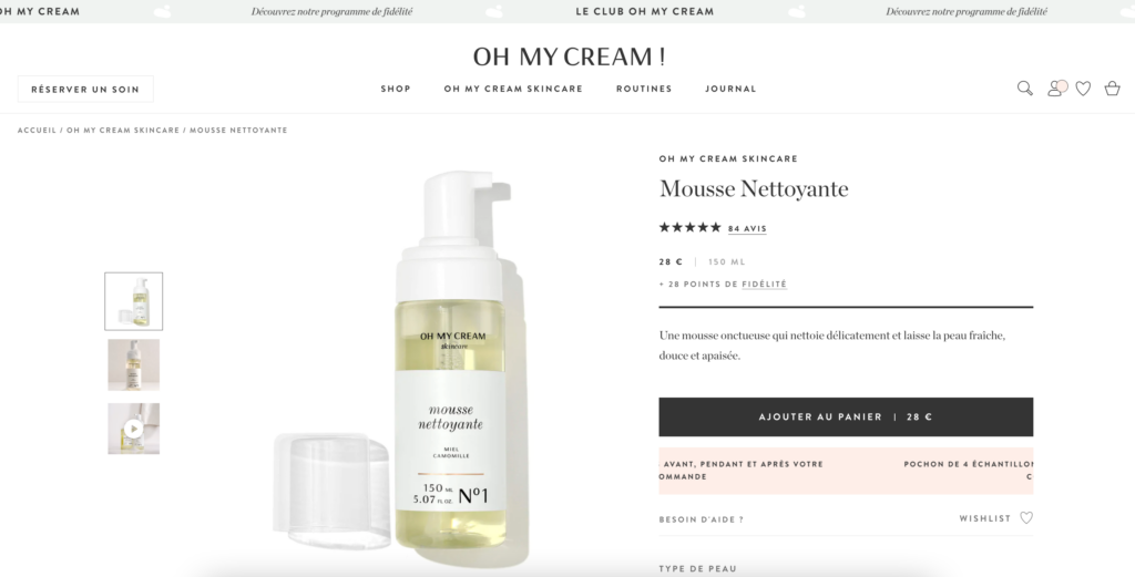On aime particulièrement la tonalité fun et les notes d’humour glissé de manière ponctuelle sur les pages produits, sans en faire trop. Ce que l’on retient des fiches produits, c’est surtout : les offres de prix dégressives, les icônes « à retenir » concernant le produit, la liste complète des ingrédients venant souligner la transparence de la marque, mais aussi l’ensemble des avis clients qui s’accompagnent également de photographies.