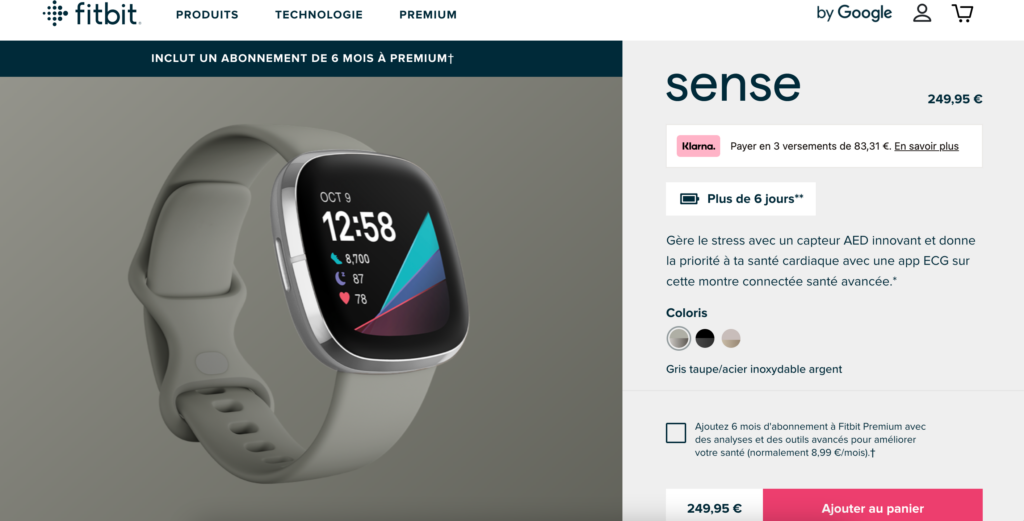 Parmi les marques de high tech et de montres connectées proposant les produits les plus performants et les sites web les plus pertinents, on peut citer le géant Fitbit. Sur la page Fitbit Sense, on aime particulièrement les visuels du produit et la vue en 360° de la montre connectée.