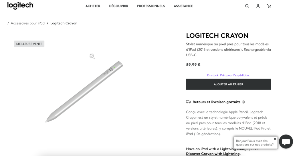 Logitech, entreprise d’électronique grand public propose de nombreux produits et accessoires pour améliorer le quotidien des consommateurs. Sur la fiche produit Logitech Crayon, nous retrouvons les informations clés dès le premier écran, à savoir : une brève description du produit, le prix, l’information sur le stock et la livraison.