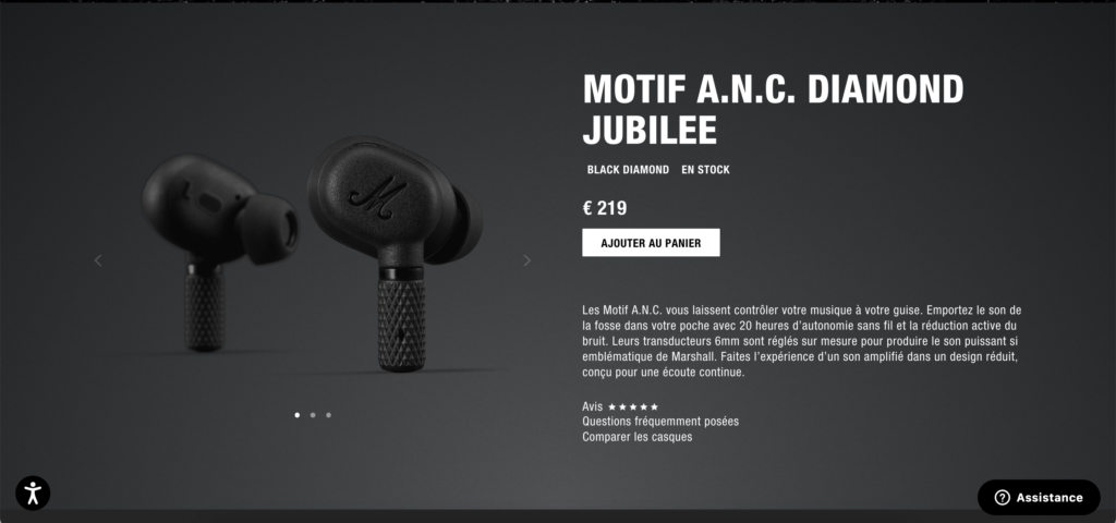 On aime particulièrement les jeux de textes et de typographies permettant de mettre en avant les informations essentielles, les visuels produit, qu’il s’agisse de packshot ou de photos lifestyle. Il est aussi intéressant de souligner la section de spécifications techniques très complètes et la FAQ liée au produit. Cette dernière mériterait néanmoins d’être traduite pour être plus facilement compréhensible par les internautes francophones.