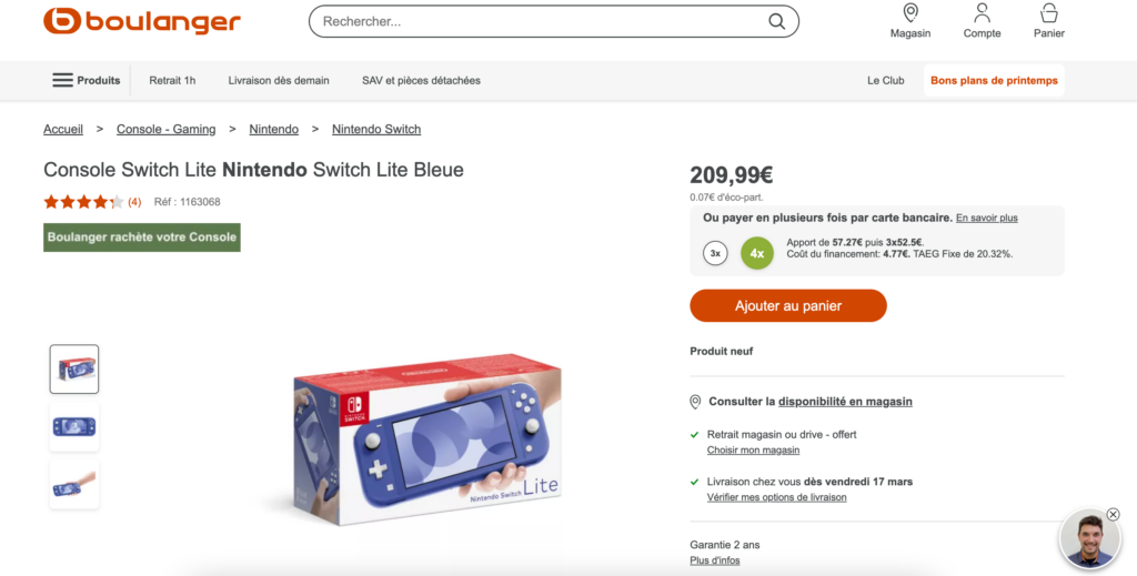 Le revendeur très connu de produits high tech, pour le bureau ou pour la maison, Boulanger, dispose d’un large catalogue de produits. Nous avons sélectionné ici la page produit dédiée à la Nintendo Switch Lite Blue. On apprécie particulièrement l’accès aux avis clients qui permet de lire l’ensemble des retours clients ainsi que l’accès à un conseiller par chatbot.