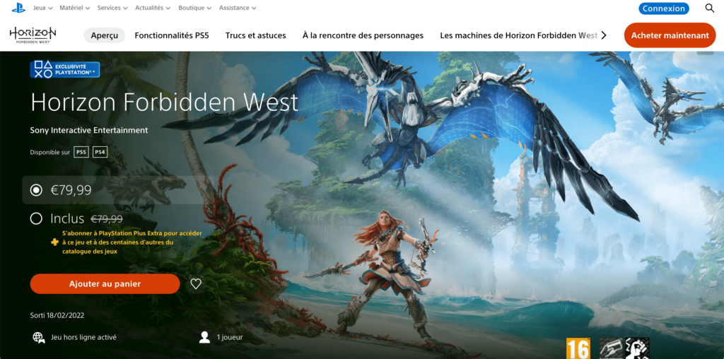 Peut-on seulement évoquer l’univers des jeux vidéos et les sites e-commerce associés sans citer PlayStation ? L’ensemble des pages produits dédiées à des jeux vidéos sont créées sous le même format chez Playstation : un premier bloc très visuel avec une image issue du jeu, le nom du jeu, le nom du créateur, les consoles associées, le prix et un bouton d’achat.