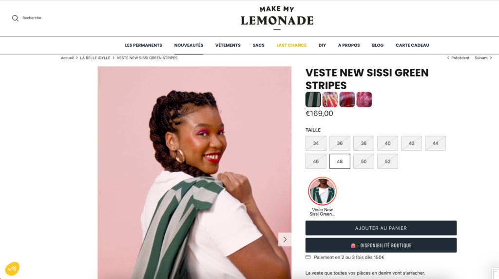 Make My Lemonade est une marque de vêtements et accessoires pensés et désignés par la créatrice de contenus Lisa Gachet. Le site e-commerce de la marque est moderne, épuré et dynamique. Dans cet exemple de page produit, on apprécie les vidéos permettant de voir le produit en mouvement, la qualité des tissus, les couleurs, ect.
