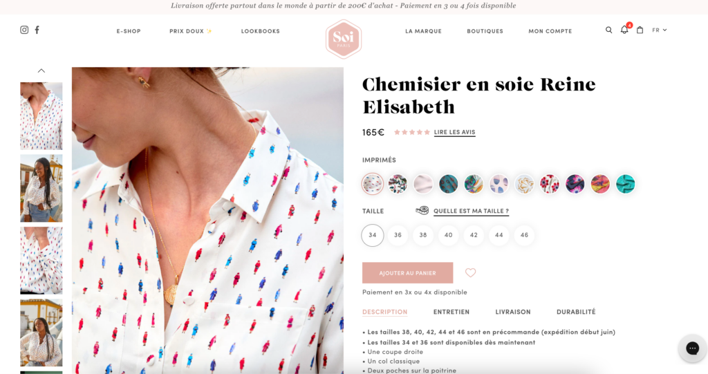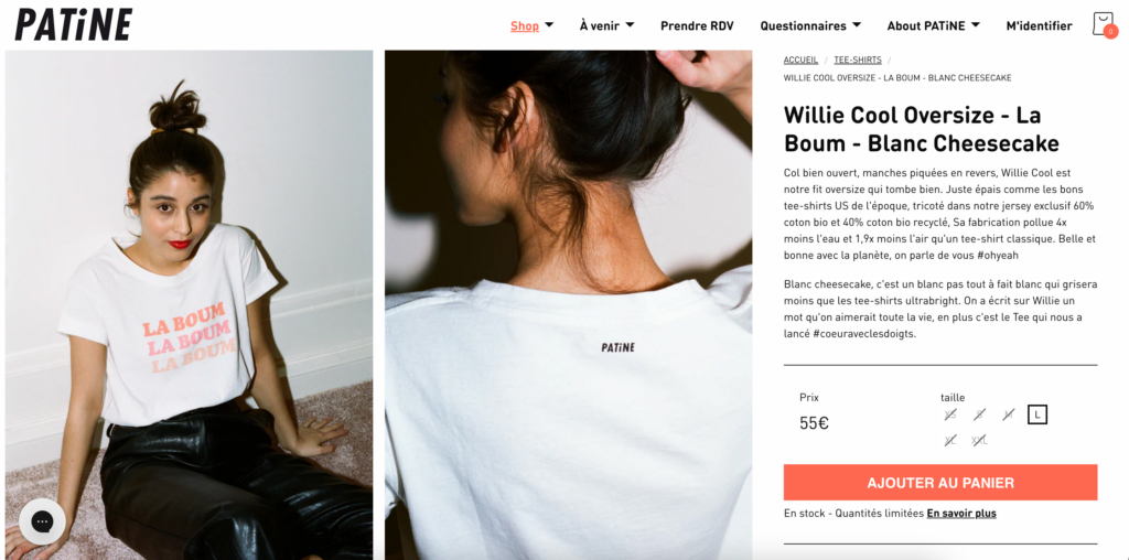 Encore un autre exemple de site proposant des collections de prêt-à-porter totalement adapté aux codes du web et qui peut servir d’inspiration si vous voulez revoir vos fiches produits mode. Patine propose des pages produits complètes reprenant : une galerie de visuels, une présentation globale du produit et des rubriques dédiées sur les avantages du produit, la durabilité ou encore des conseils pour trouver la taille idéale.