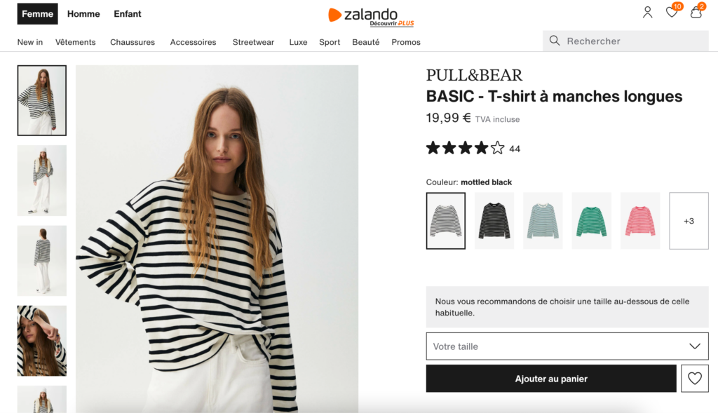 On remarque que les bonnes pratiques du commerce en ligne sont parfaitement appliquées : la galerie d’images, les indications pour aider à choisir la bonne taille, l’affichage d’une note et le bouton d’action très visible, en orange, pour contraster avec le blanc du fond et rappeler le logo de la marque.