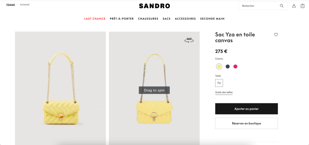 La vue des produits en 360 degrés est un vrai avantage, permettant de voir le produit sous toutes ses coutures et de faire un focus sur les finitions. Cette vue est particulièrement utile pour les marques de prêt-à-porter, d’accessoires ou de luxe.