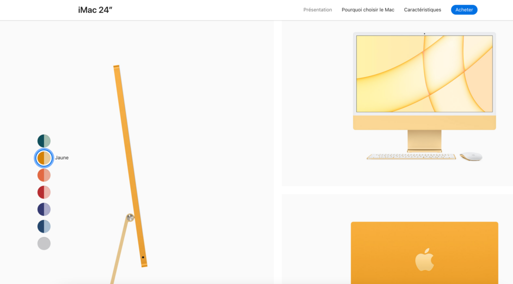 On ne présente plus le site du géant Apple et il était évident que celui-ci apparaisse dans notre top des exemples de fiches produit. Chaque page du site pourrait être prise en exemple, mais puisqu’il fallait faire un choix, nous avons opté pour la fiche produit iMac 24.
