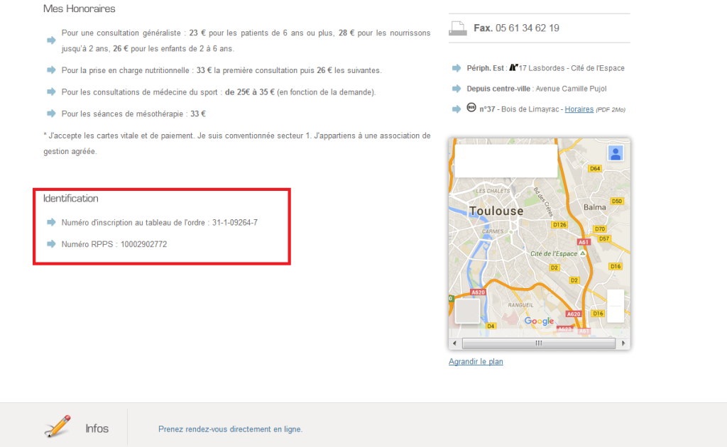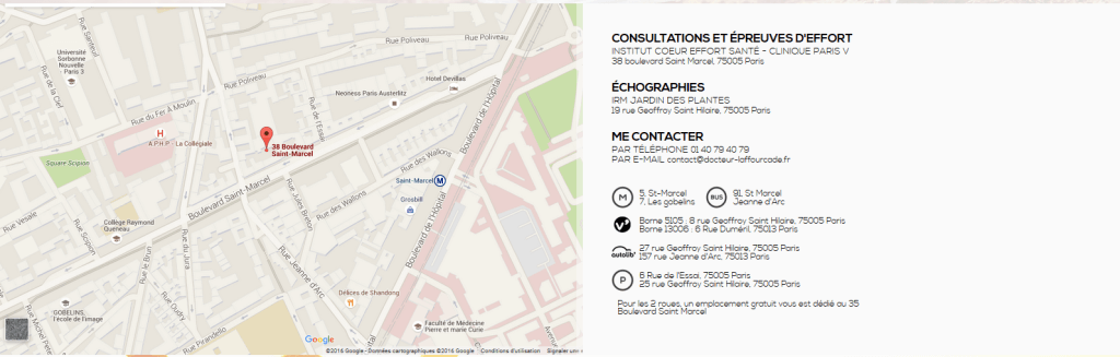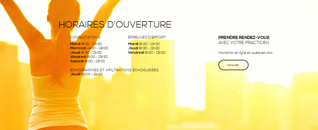 - Infos pratiques : accès, parking, transports, accessibilité PMR, horaires, tarifs, tiers payant.