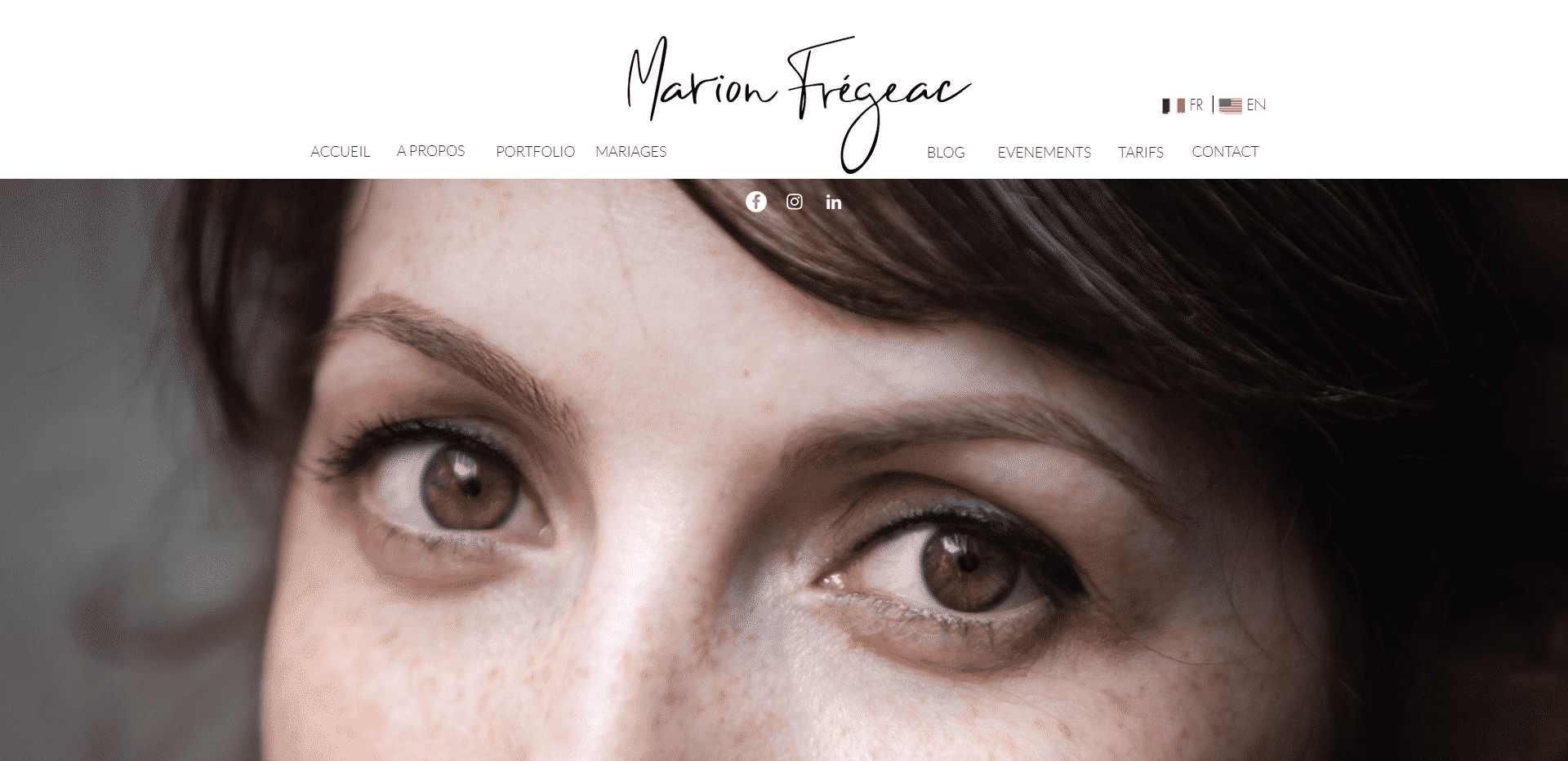 Ici, la photographe Marion Frégeac présente ses prestations avec une page d’accueil dynamique. Les visiteurs sont ensuite instantanément dirigés vers des rubriques pertinentes répondant aux informations courantes recherchées par les clients potentiels.