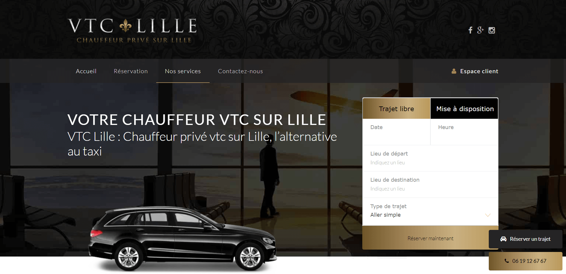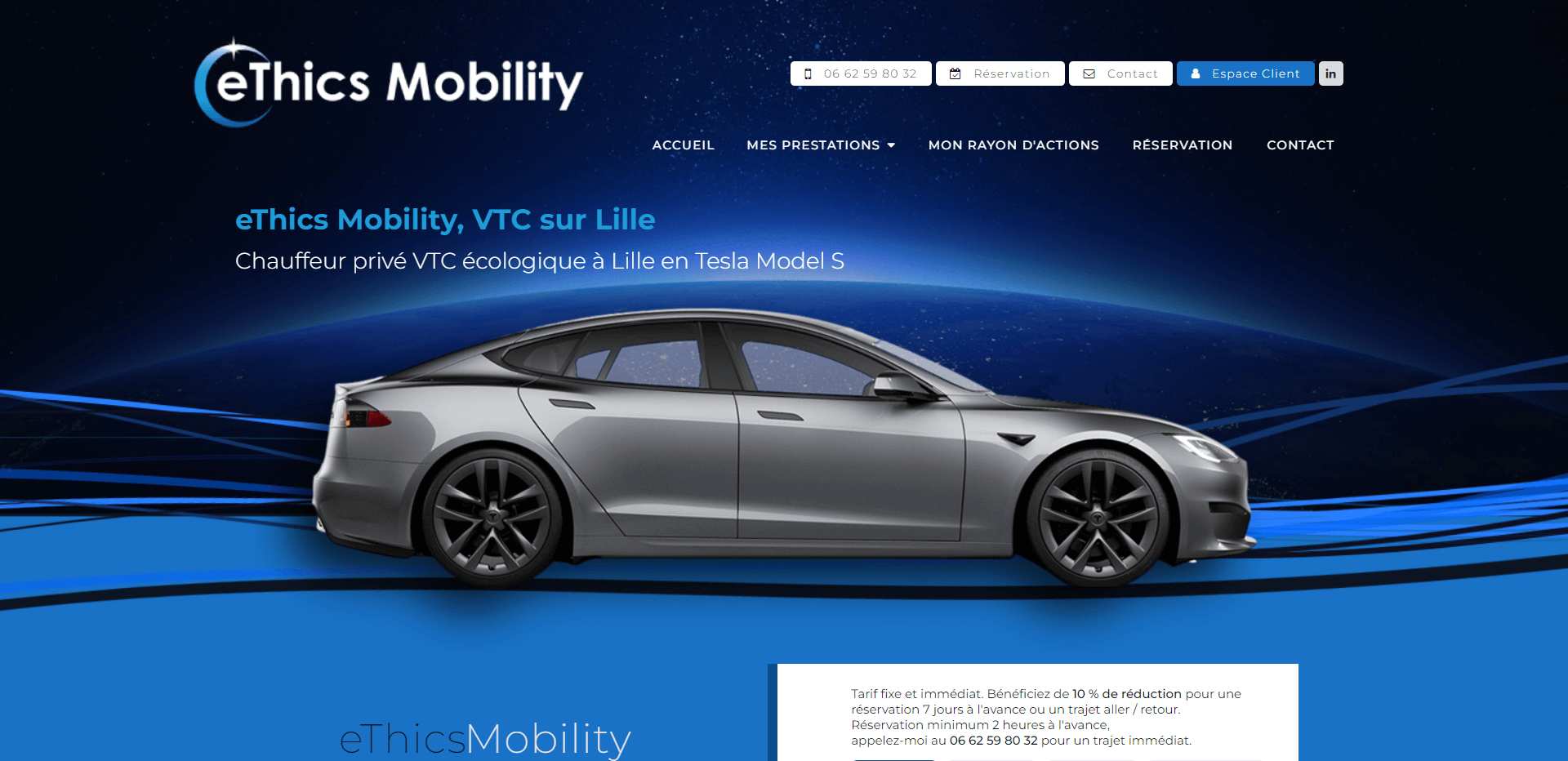 Sur ce site de VTC de Lille, on trouve en un clic d’une part toutes les informations pratiques, et les options de réservation ; et d’autre part, il met en avant ses caractéristiques spécifiques, notamment le respect de l’écologie.