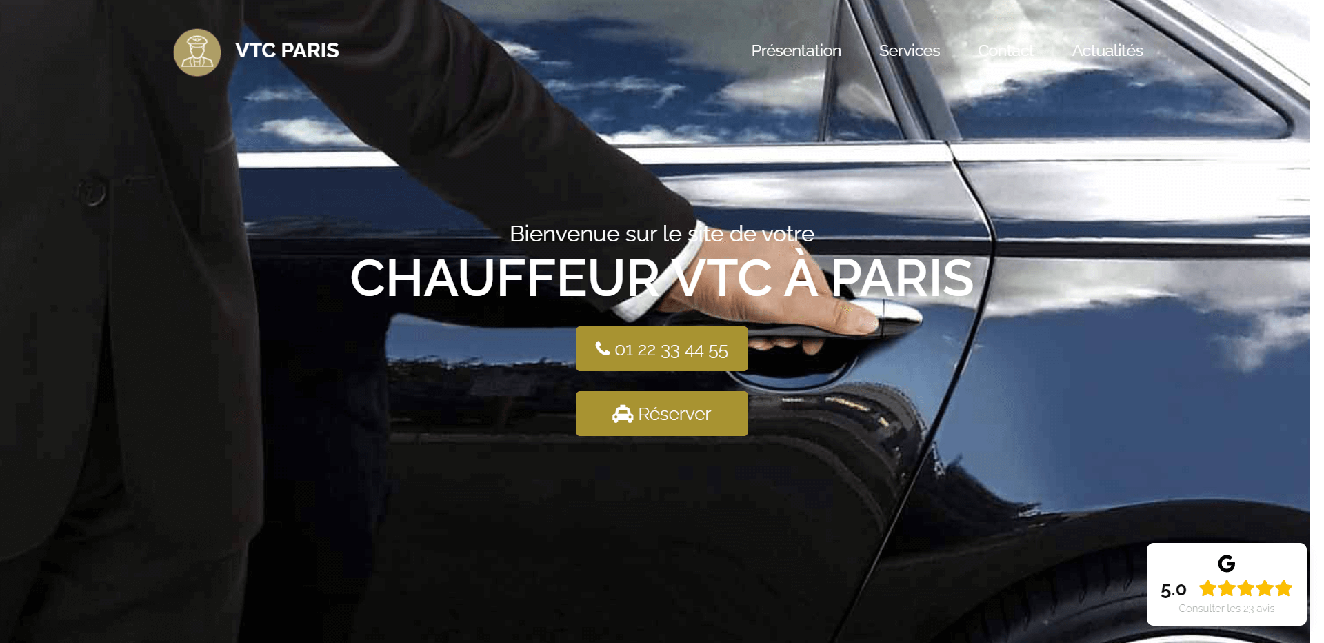 Sur ce site de VTC réussi, on peut contacter immédiatement le chauffeur, ou réserver une course. On voit également la note et le nombre d’avis laissés par d’anciens clients sur Google, une preuve de fiabilité fortement appréciée.