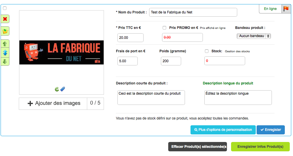 Pour commencer, il suffit simplement de définir les modes de paiement, avec son RIB notamment, et vous avez ensuite la possibilité d’ajouter des produits. On retrouve un back office plutôt complet, où l’on retrouve sur la même page : la description du produit, son prix, les frais de port, la possibilité de déclinaison du produit, les stocks ainsi que des outils pour le référencement.