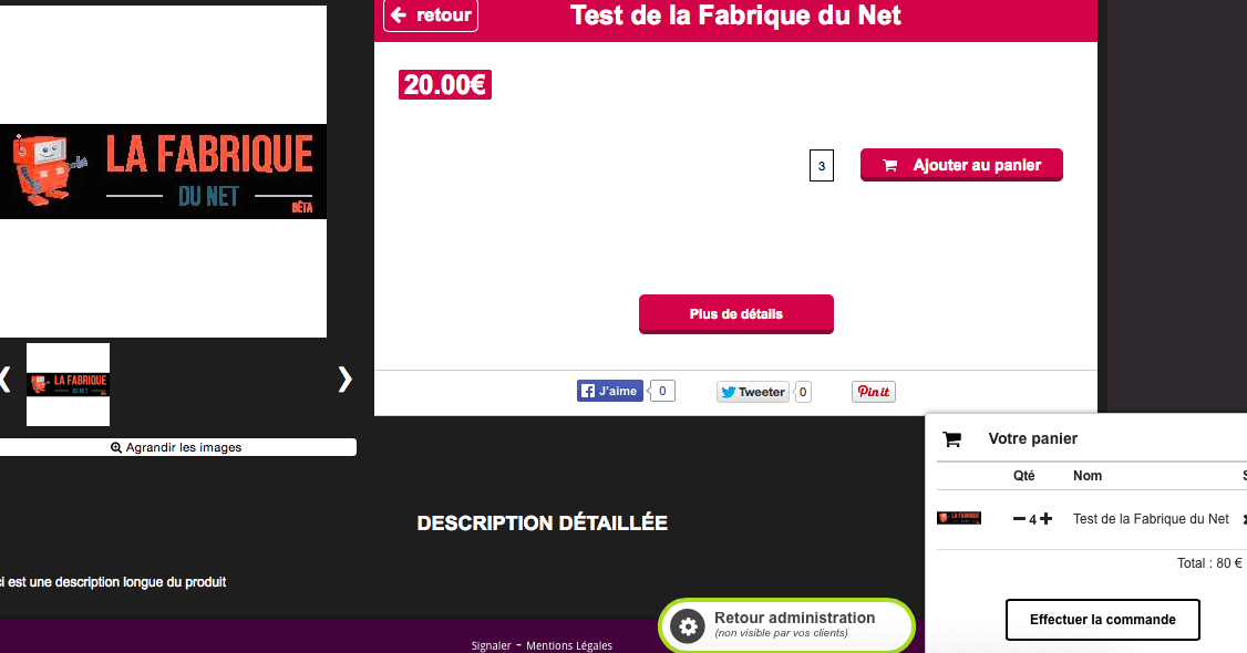 - Gestion d’un panier : Une fois le produit créé, il apparaît dans la boutique en ligne sur le menu, et on peut ajouter autant d’articles que l’on souhaite, avec la possibilité de gérer la quantité.