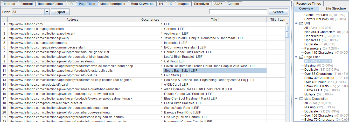 J’ai aussi crawlé le site avec l’application Screaming Frog très appréciée des webmasters, qui permet d’analyser en détails chaque page.