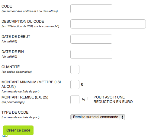 - Codes de réduction : Plutôt bien fait, il est possible de sélectionner la durée, le montant ou le pourcentage ainsi que la quantité.