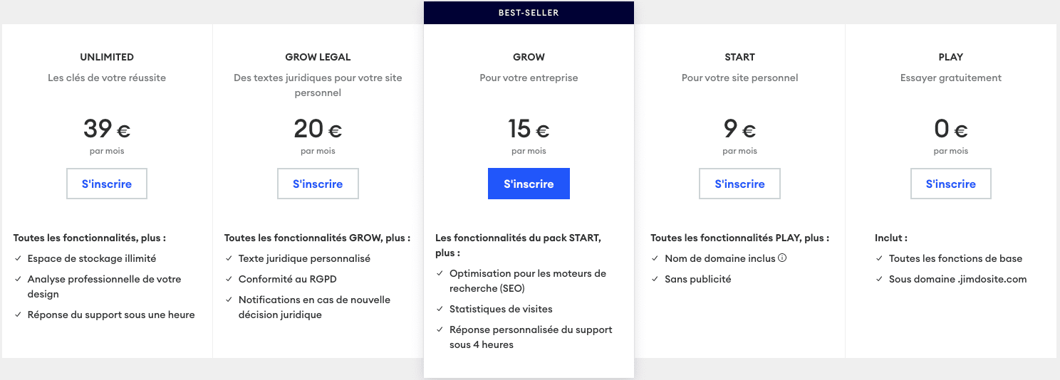- Grow, à partir de 15€ par mois. L’offre de Jimdo pour un site web professionnel pensé pour les entreprises et les indépendants, facturée 15€/mois (en facturation annuelle soit 180€/an). Vous avez bien sûr votre nom de domaine personnalisé, l’accès à l’outil d’optimisation pour les moteurs de recherche (SEO) ainsi que 5 adresses e-mail de redirection.