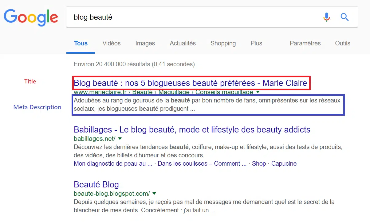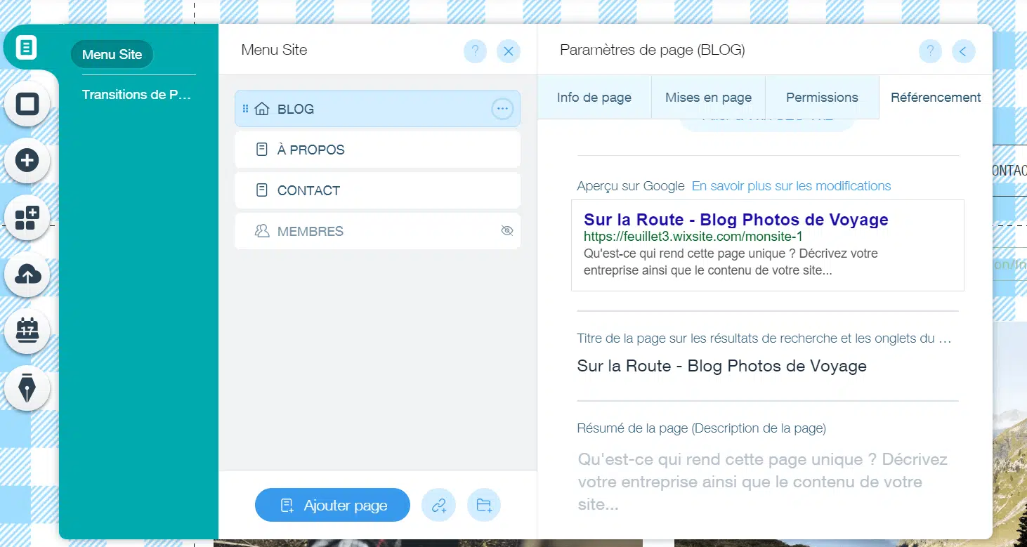 Dites-vous que pourrez à tout moment modifier la mise en page et le design de votre blog Wix. Vos choix ne sont pas irréversibles. Une des autres étapes incontournables, lorsque l’on crée un blog, c’est le choix du nom. Nous ne nous attarderons pas sur l’importance du nom, car vous le savez surement déjà. Une étape à ne pas oublier non plus : vous devez rédiger le Title et la Meta Description de votre blog. Ce sont les textes qui apparaissent dans les pages de résultats de Google. Ils ont pour fonction de décrire le contenu de votre blog.