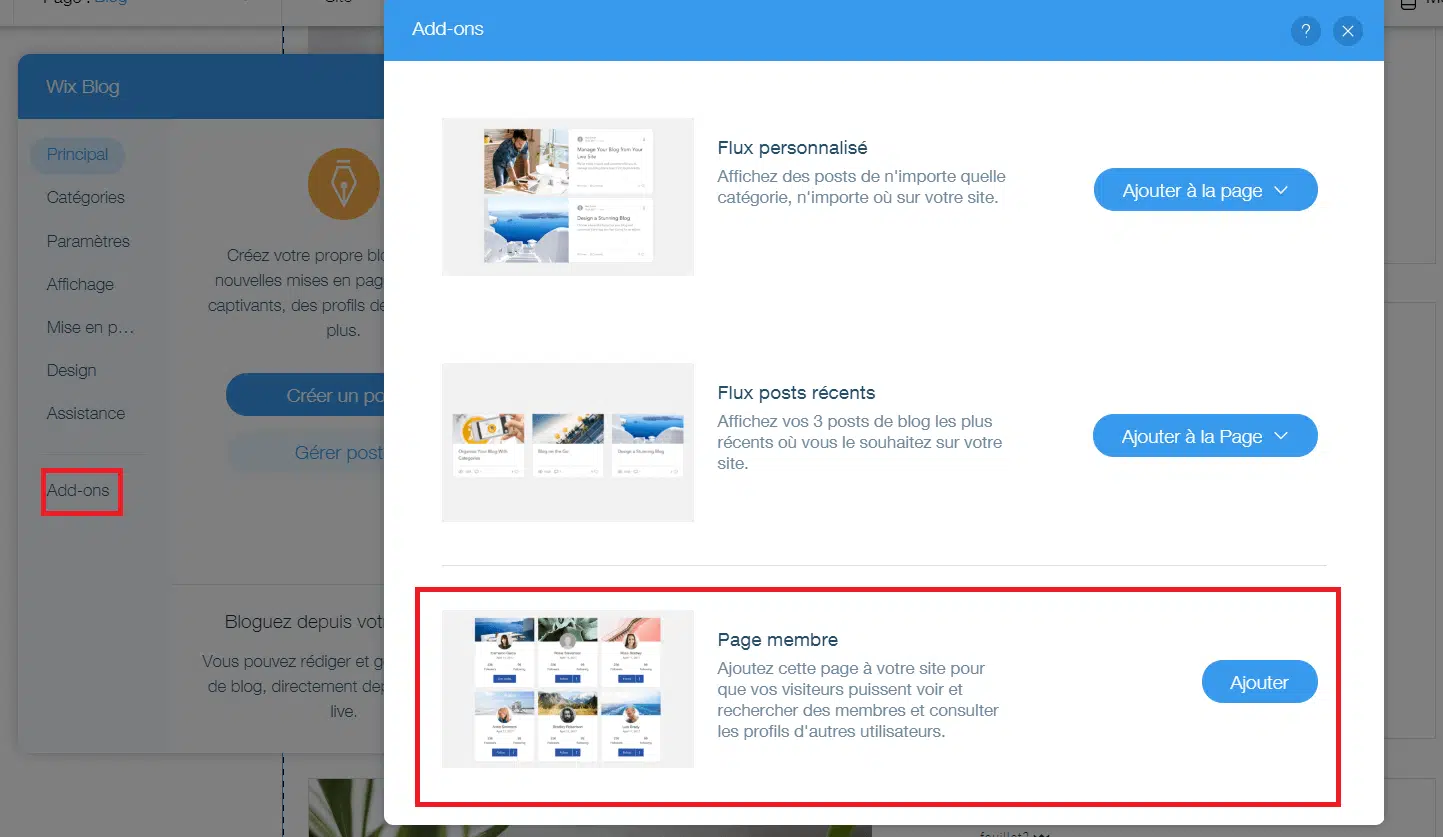 Comme nous l’avons déjà dit, il est possible avec Wix Blog d’ajouter des rédacteurs. Pour que cela soit possible, vous devez ajouter la fonctionnalité « Page membre ». Pour cela, rendez-vous dans l’interface « Paramètres » et cliquez sur « Add-ons ».