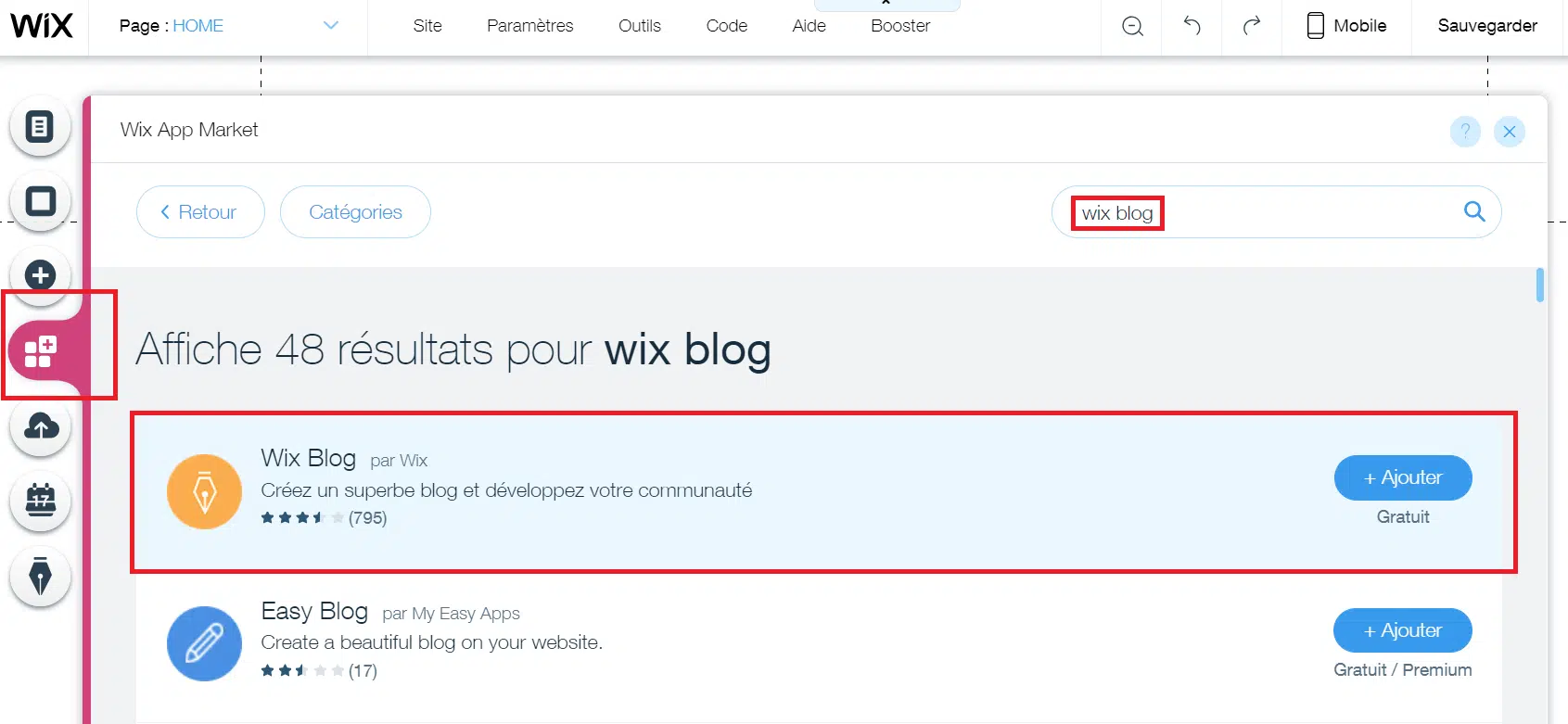 Certains templates n’ont pas de blog intégré. Pour transformer votre site Wix en blog, vous devez installer l’application Wix Blog. Pour cela, utilisez le menu de gauche pour accéder au Wix App Market. Dans la barre de recherche, tapez « wix blog ». Wix Blog est le premier résultat qui apparaît.