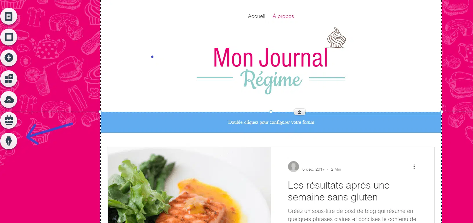 Une fois arrivé sur l’éditeur de Wix, pour éditer votre blog, il vous suffit de cliquer sur le bouton « Mon blog » dans le menu de gauche :