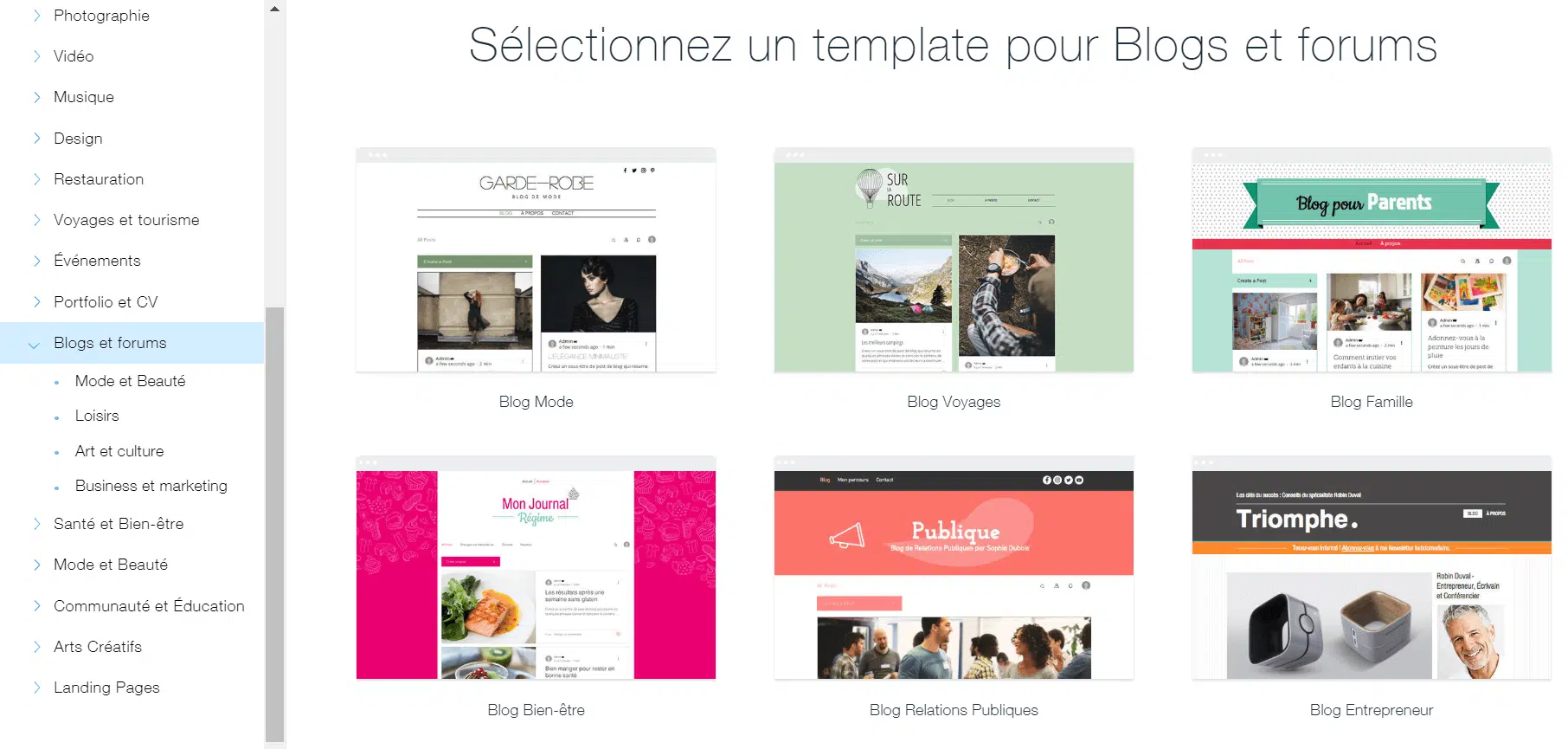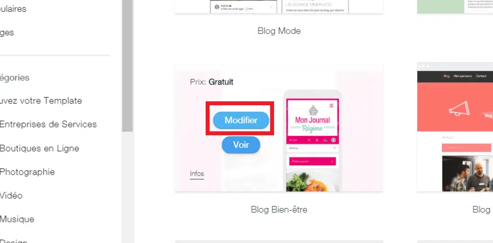 Lorsque vous créez un site sur Wix, la première étape consiste à choisir un « thème » dans la bibliothèque de templates Wix. La plupart des templates proposés par Wix intègrent déjà un blog. C’est le cas bien évidemment des templates appartenant à la catégorie « Blogs et forums », mais pas uniquement. Si vous choisissez un template qui a déjà un blog intégré, vous n’avez pas à installer « Wix Blog », il l’est déjà.