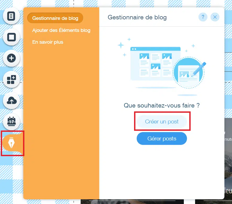 Pour ajouter un article de blog, il vous suffit de cliquer sur l’icône de Wix Blog, dans le menu de gauche, et de cliquer sur « Créer un post ».