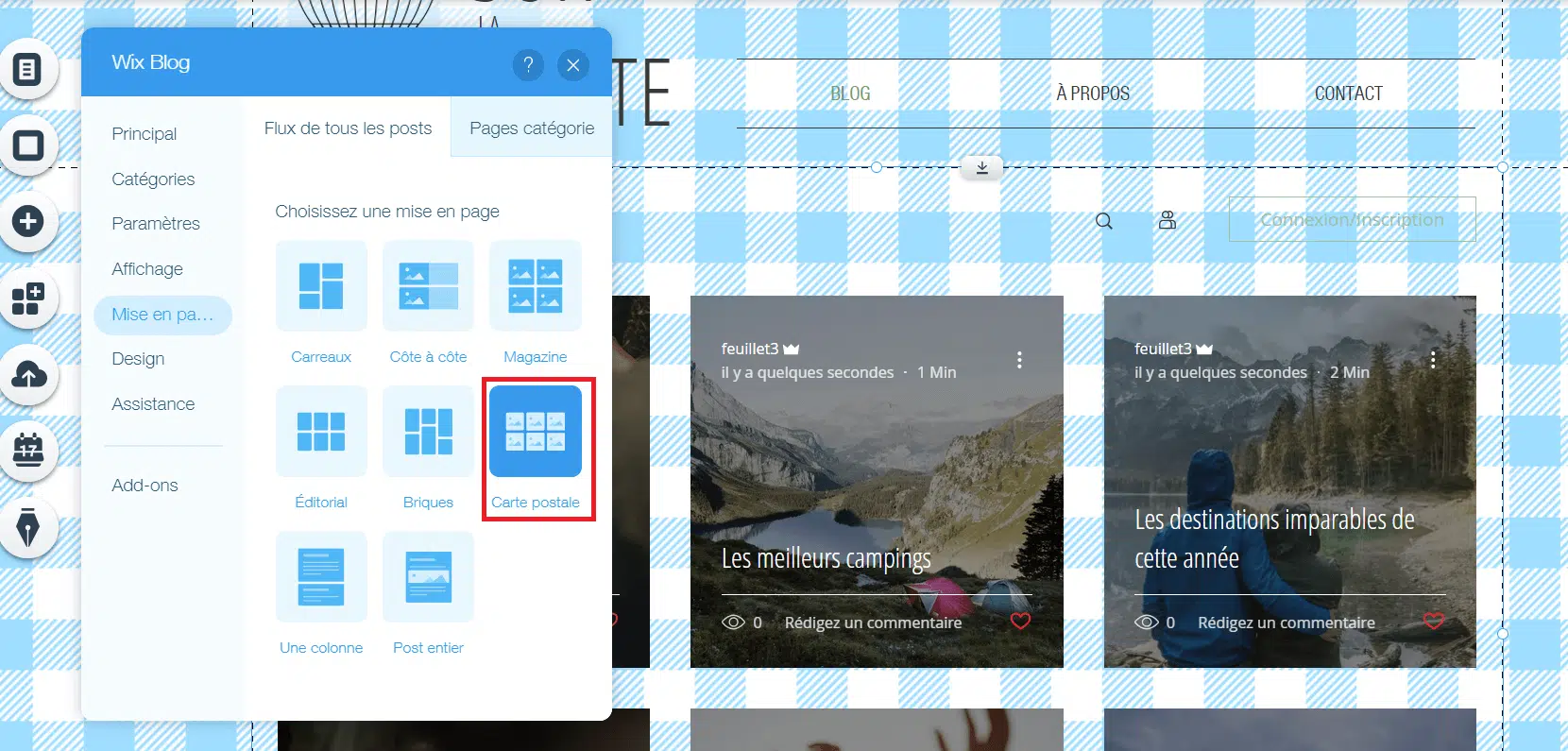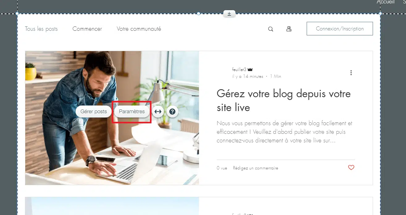 Vous pouvez aussi personnaliser la manière dont sont organisés vos articles sur la page de votre blog. Pour cela, cliquez sur la partie centrale de la page de votre blog, puis sur « Paramètres ».