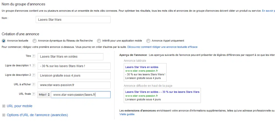 1 groupe d’annonces = 1 intention = 1 landing page.