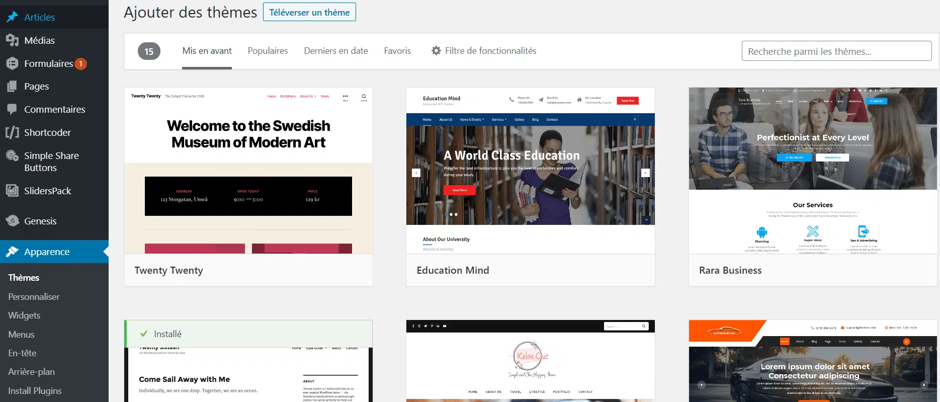 Ce qu’il y a de bien avec les thèmes WordPress, c’est que vous n’avez pas forcément besoin d’en acheter un. Il y a toute une sélection de templates gratuits dans la bibliothèque WordPress. Vous pouvez voir un aperçu et l’installer en un clic. Ils ont été créés et soumis par des développeurs, et sont passés par les yeux vigilants de l’équipe WordPress qui examine les thèmes. Chacun a également une note des utilisateurs, ce qui est un bon moyen de s’assurer que vous ne vous retrouvez pas avec un template raté.
