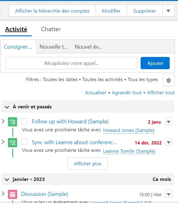 Là encore, Salesforce Sales Cloud met le paquet dans le suivi des interactions clients. En plus du suivi complet des interactions, celles-ci peuvent être automatiquement ajoutées à la fiche du client correspondant.