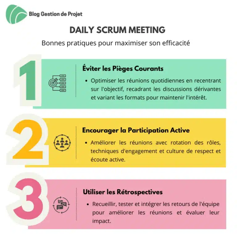Le Scrum Master doit aussi veiller à ce que les problèmes remontés soient réellement pris en charge par la suite pour éviter un effet « réunionite ». La présence de managers ou de clients doit être réfléchie pour ne pas inhiber la transparence des échanges. Enfin, maintenir la discipline et l’utilité perçue du daily scrum dans la durée peut devenir un défi quand la pression des deadlines augmente.