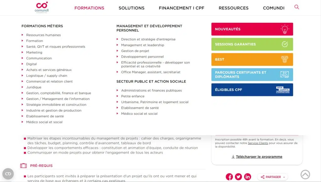 Comundi Compétences propose une formation sur les fondamentaux du management de projet. L’idée est d’acquérir les outils nécessaires à la gestion de projet. Ainsi, l’apprentissage est concentré sur le démarrage projet, la rédaction de cahier des charges technique, l’organisation de kick off, la définition d’une équipe projet… le tout jusqu’au bilan.