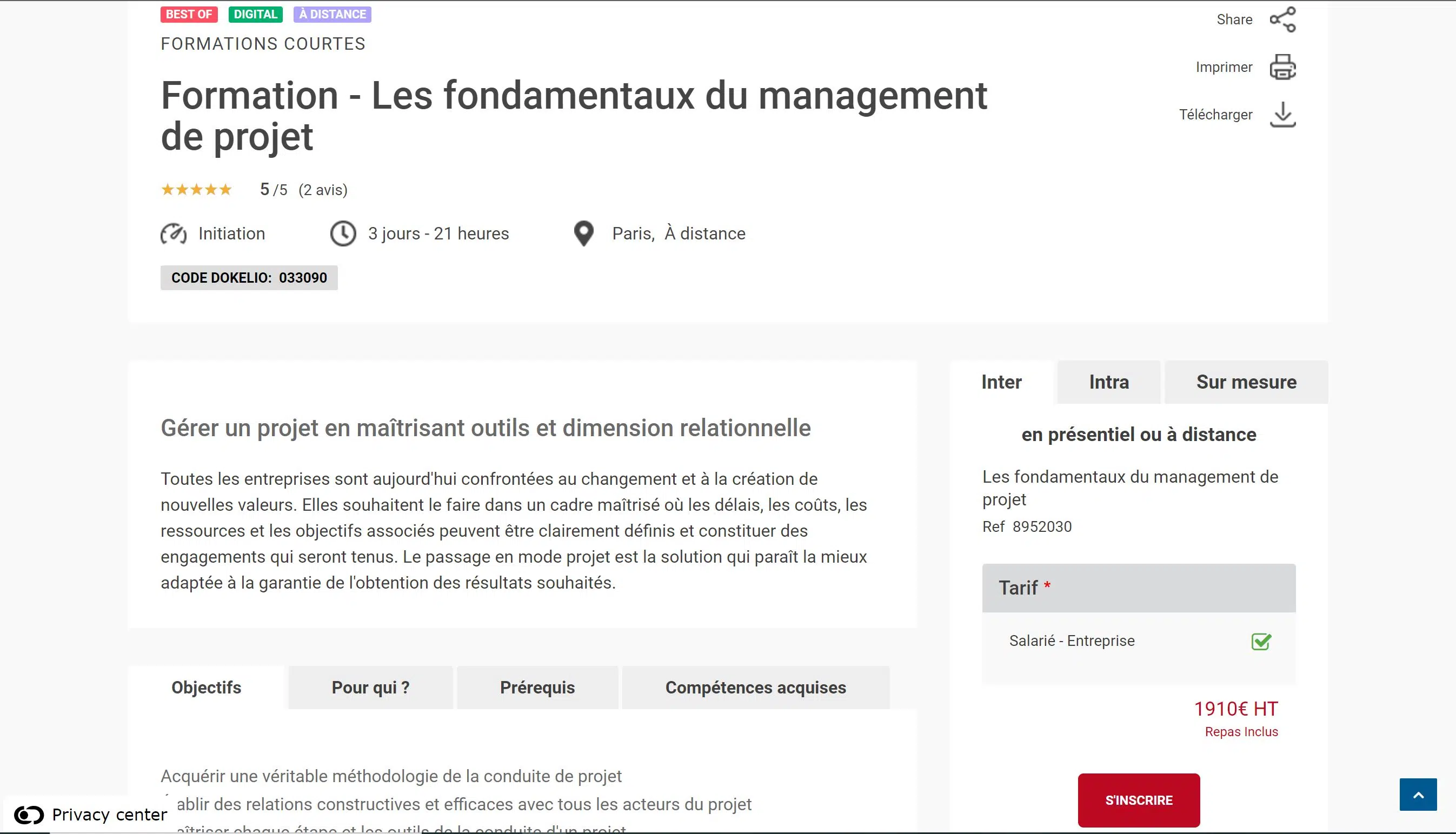 - Prix : 1490 € – finançable par le plan de développement des compétences de l’entreprise