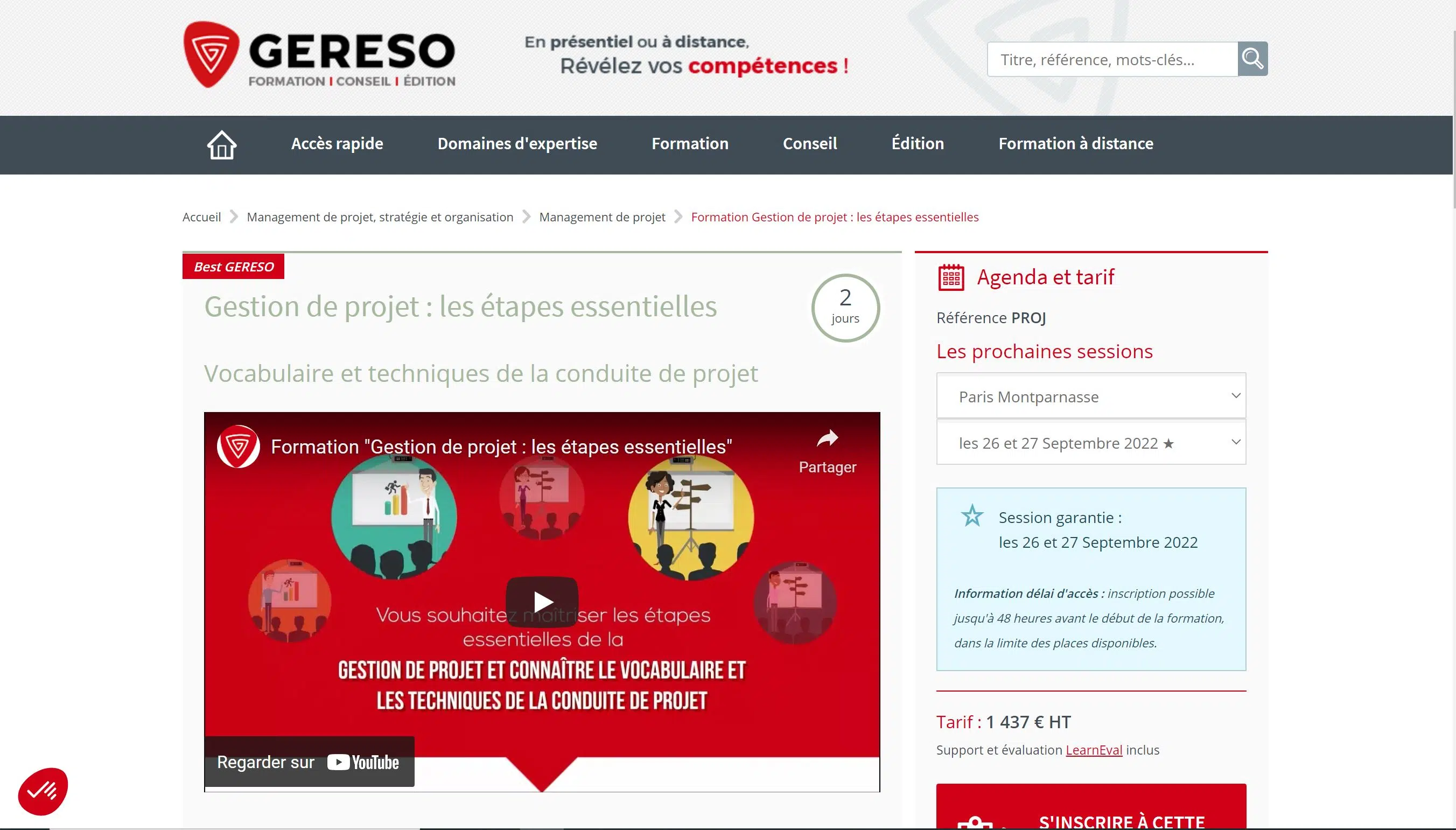 Geresco propose de vous former à la gestion de projet, le tout sous la forme d’étapes essentielles à connaître. Comme dans toutes les formations proposées jusque-là, vous retrouverez une base commune à savoir la gestion de planning, d’équipe, de budget et de pilotage. En revanche, la particularité est que celle-ci est axée sur la culture et l’environnement projet en général.