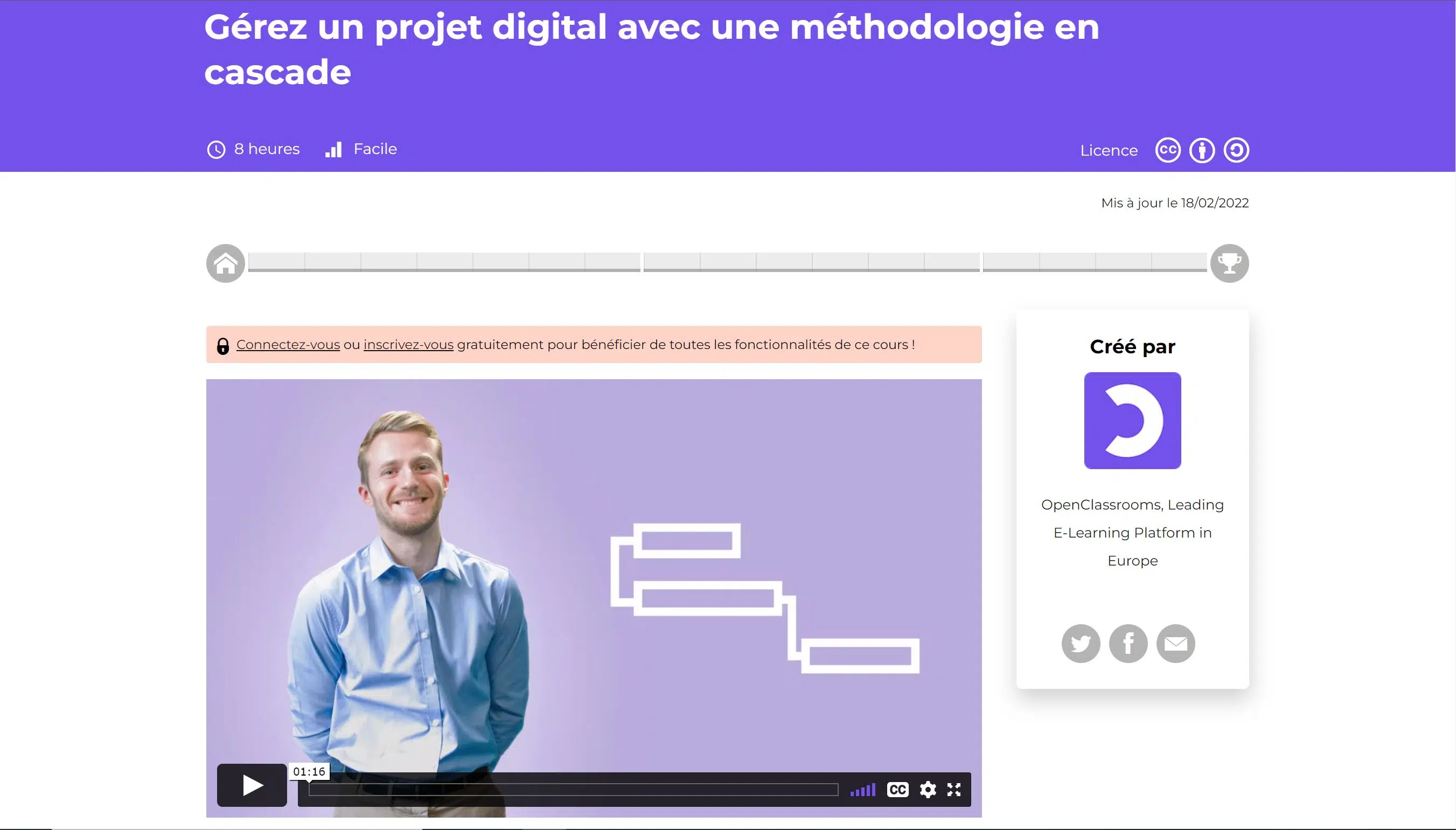 Que serait un article consacré aux formations sans évoquer Openclassrooms… L’organisme dispose de plusieurs formations en gestion de projet dont celle-ci, axée sur la gestion de projet digital avec une méthodologie hybride, combinant les avantages des approches agiles et traditionnelles.