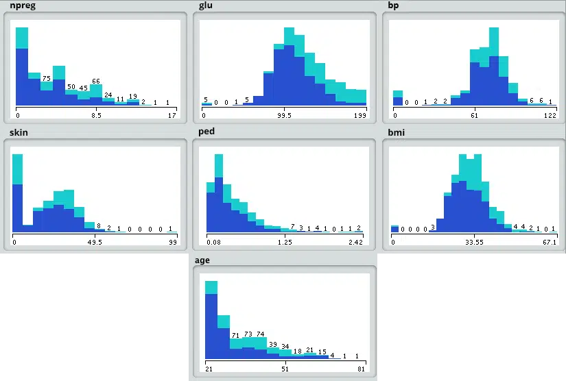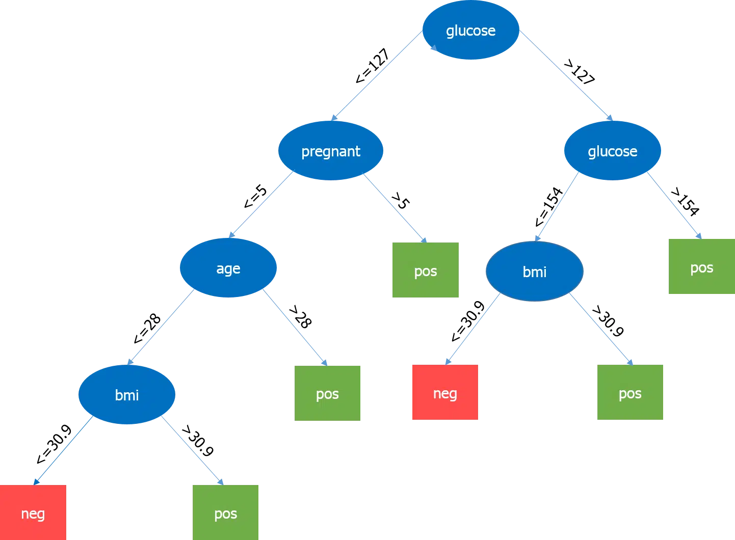 La précédente étape a permis de dégager des insights. Maintenant, pour ce type de problématique, il peut être intéressant d’utiliser un arbre de décision. Comme on a déjà à disposition la plupart des attributs importants (npreg, bmi…), on peut utiliser la technique d’apprentissage non-supervisée pour construire le modèle. L’arbre de décision permet de prendre tous les attributs en compte en une seule fois – ceux qui ont une relation linéaire comme ceux qui ont une relation non-linéaire. Dans ce cas, il est possible d’observer différentes relations entre les variables, certaines pouvant être linéaires et d’autres non-linéaires, ce qui justifie l’utilisation de modèles flexibles comme les arbres de décision. Il est possible d’utiliser différentes combinaisons d’attributs pour produire plusieurs arbres – l’idée étant à la fin d’implémenter le plus efficace.