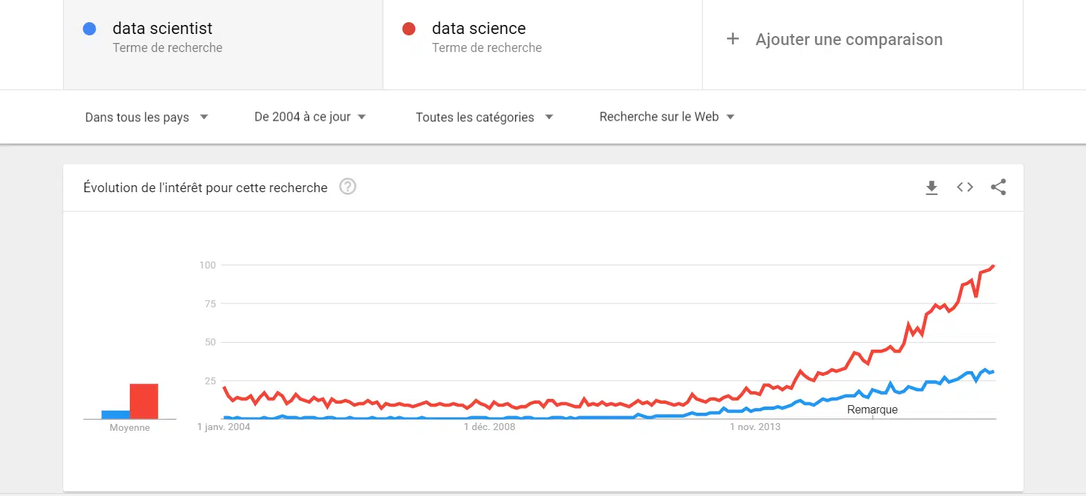 Le deuxième constat, c’est que malgré tout on parlait de Data Science avant 2008, et même en 2004 (malheureusement, il n’est pas possible via Trends de remonter avant 2004…) ! Donc, ceux qui vous disent que la Data Science est une discipline très récente se trompent. La Data Science est une discipline plus ancienne qu’on ne le pense. En un sens, cette discipline a toujours existé. Sauf qu’il y a 30 ans, on ne parlait pas de « Data Science », le terme n’existait pas.
