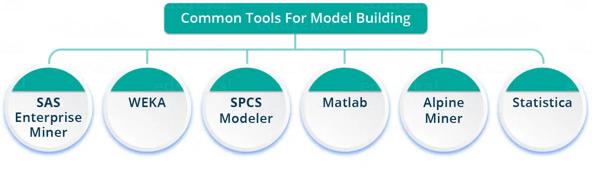 Dans cette étape, vous allez devoir développer vos jeux de données. Il y a deux possibilités. Soit vous estimez que les outils que vous utilisez actuellement sont suffisants pour faire tourner les modèles. Soit vous estimez que vous avez besoin d’un environnement plus robuste. Vous allez devoir analyser plusieurs techniques de learning pour construire le modèle : le techniques de classification, d’association, de regroupement. Voici une série d’outils permettant de construire votre modèle :